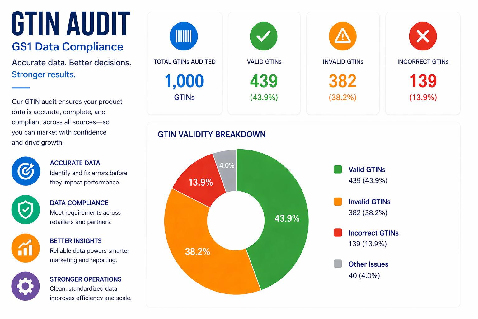 – Confirming that each GTIN is correctly structured, properly encoded, and actively registered in GS1 databases
